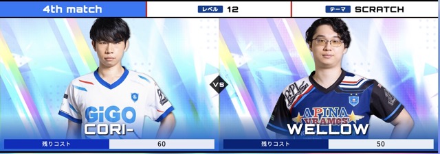 GiGOとしては1勝をおさえたい場面ですが3rdUCCHIE4thWELLOWの並びがかなり厳しいか。